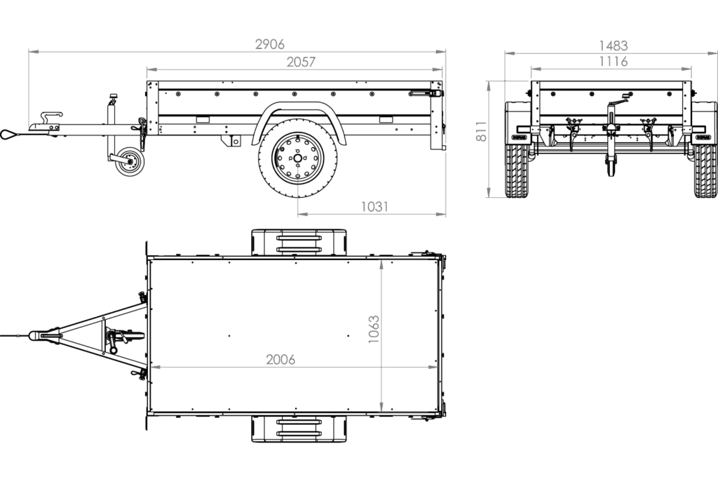 - Abmessungen des Anhängers: 2057 mm x 1116 mm.